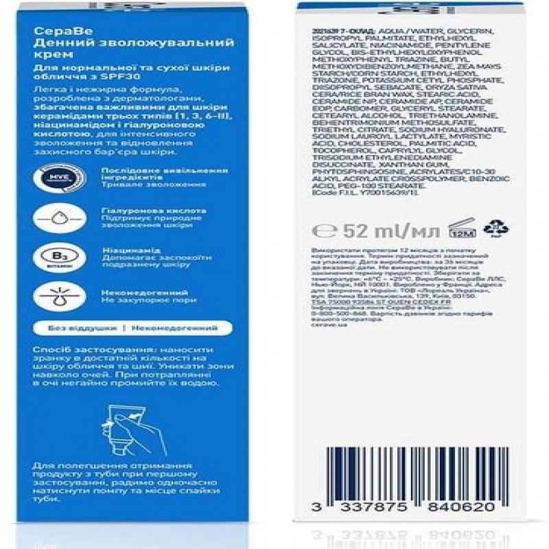 Денний зволожувальний крем CeraVe для нормальної та сухої шкіри обличчя із SPF30 52 мл (333787584062 525.0 ₴ |